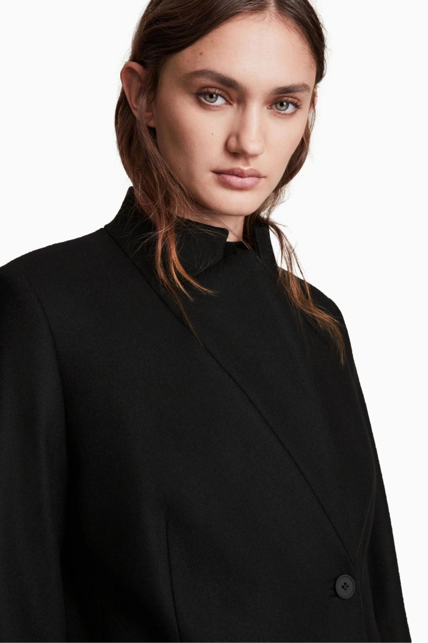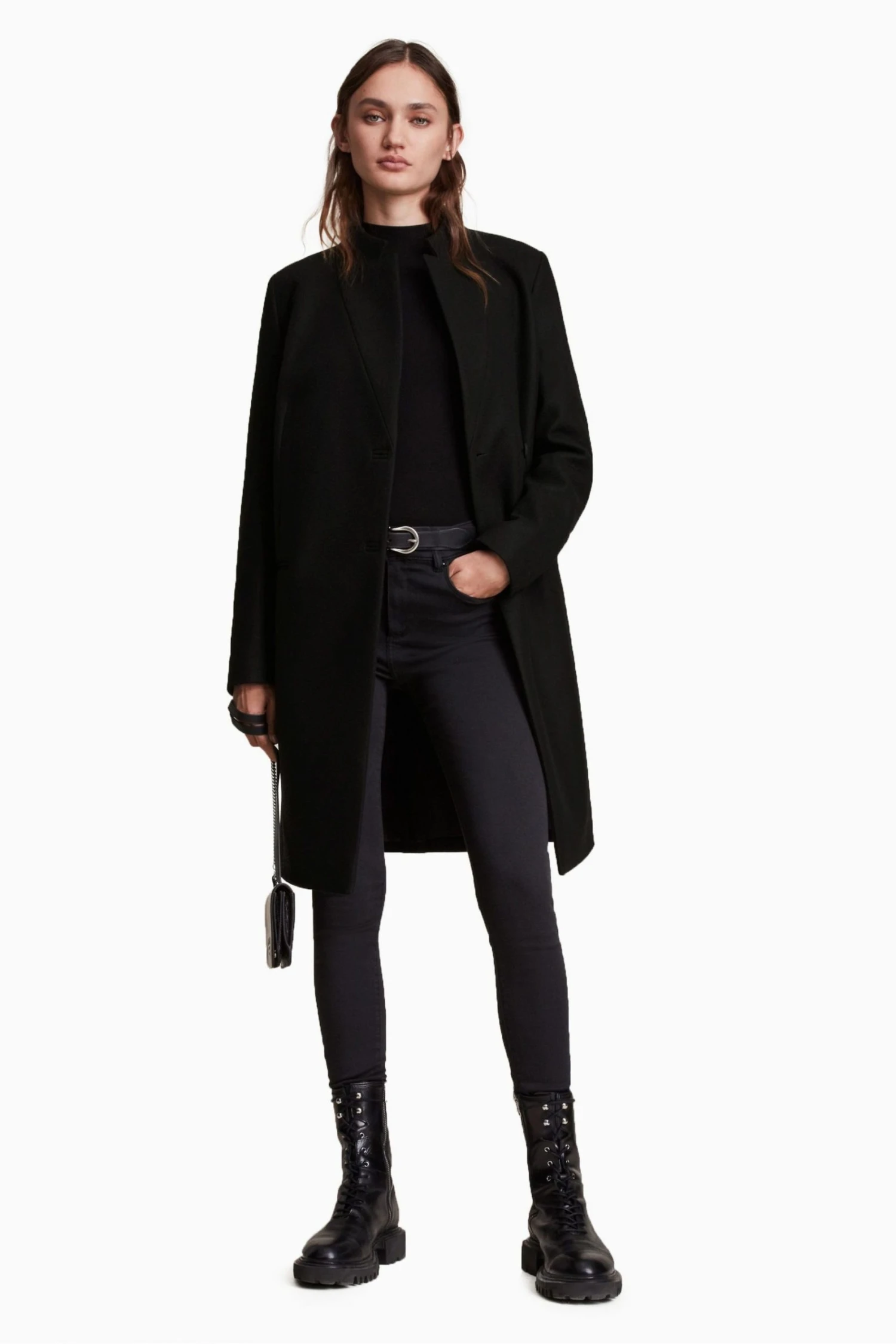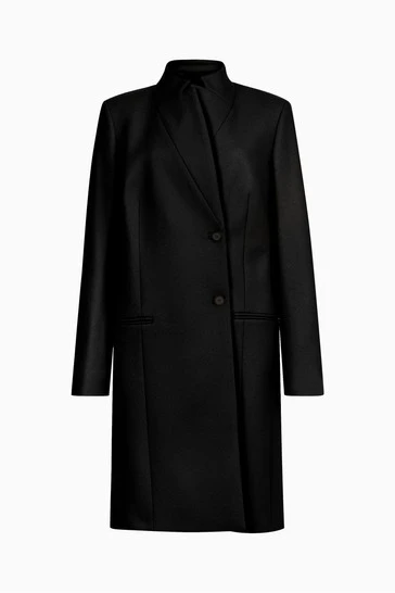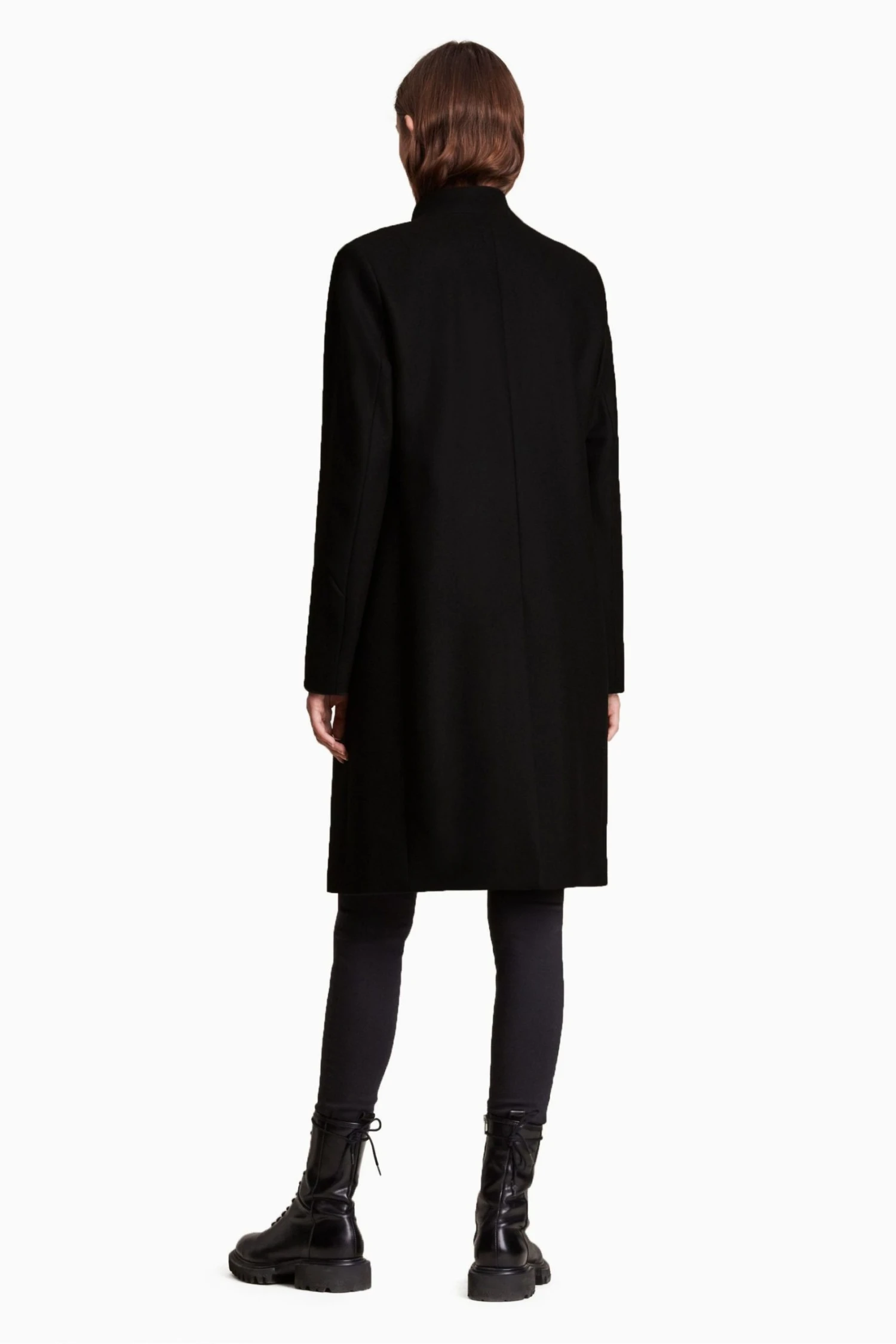 Featuring button closure, regular fit, below knee length, collar, long sleeve, single breasted classic coat, with stand collar detail and two pockets.