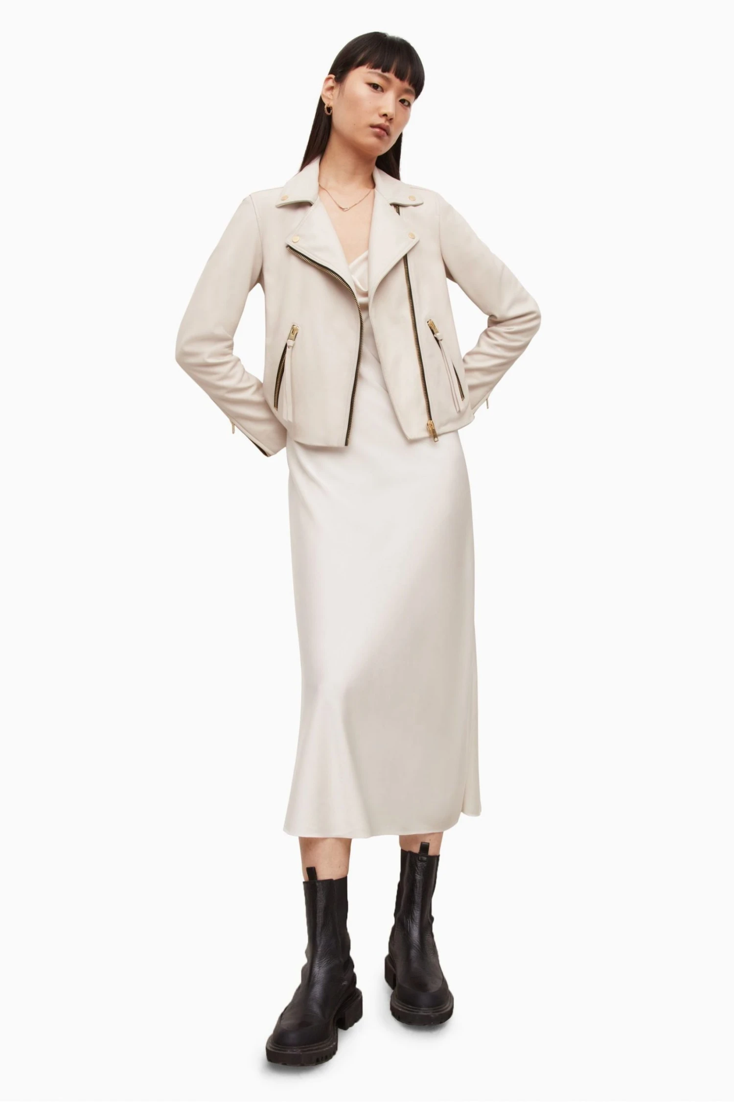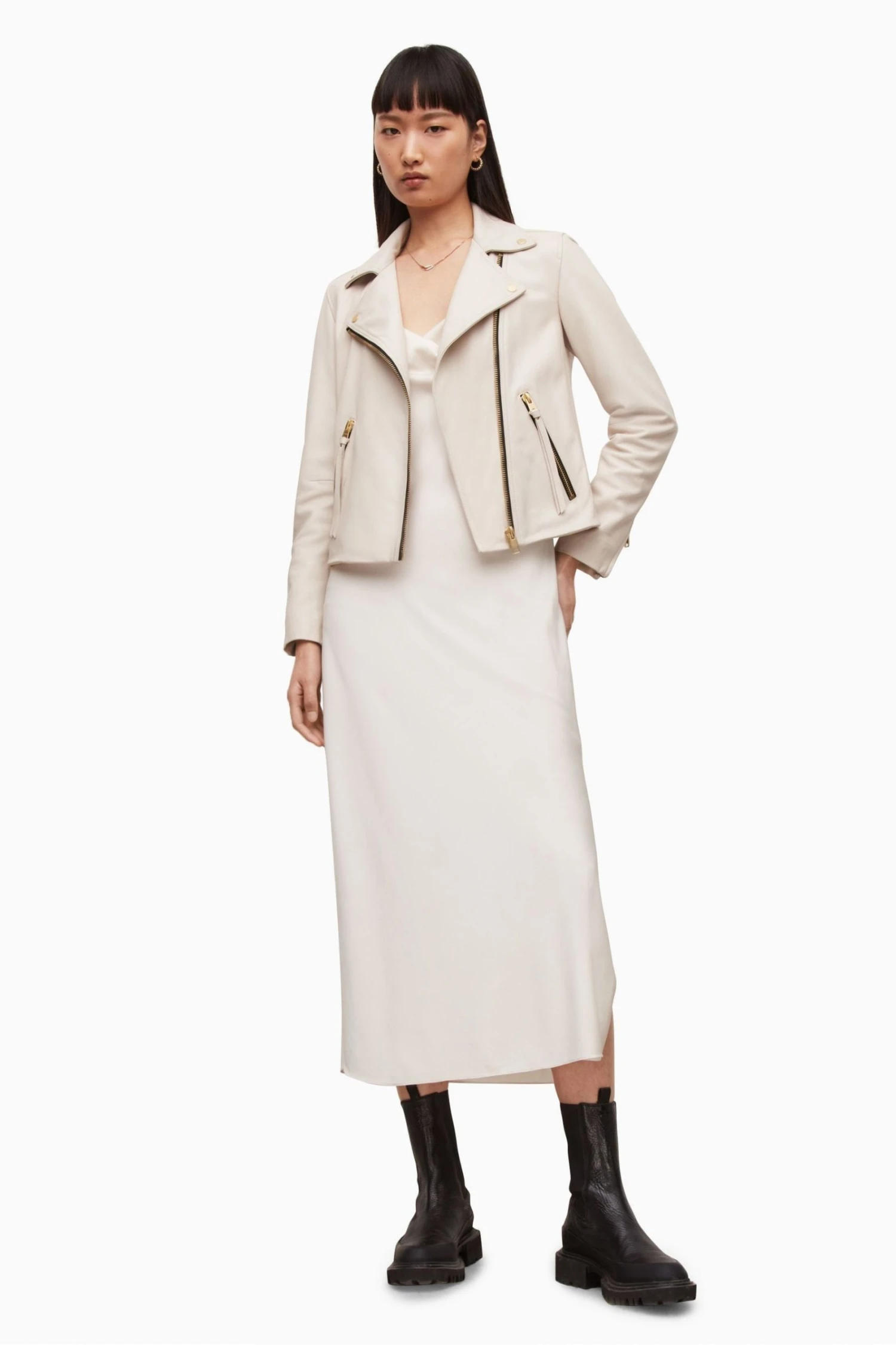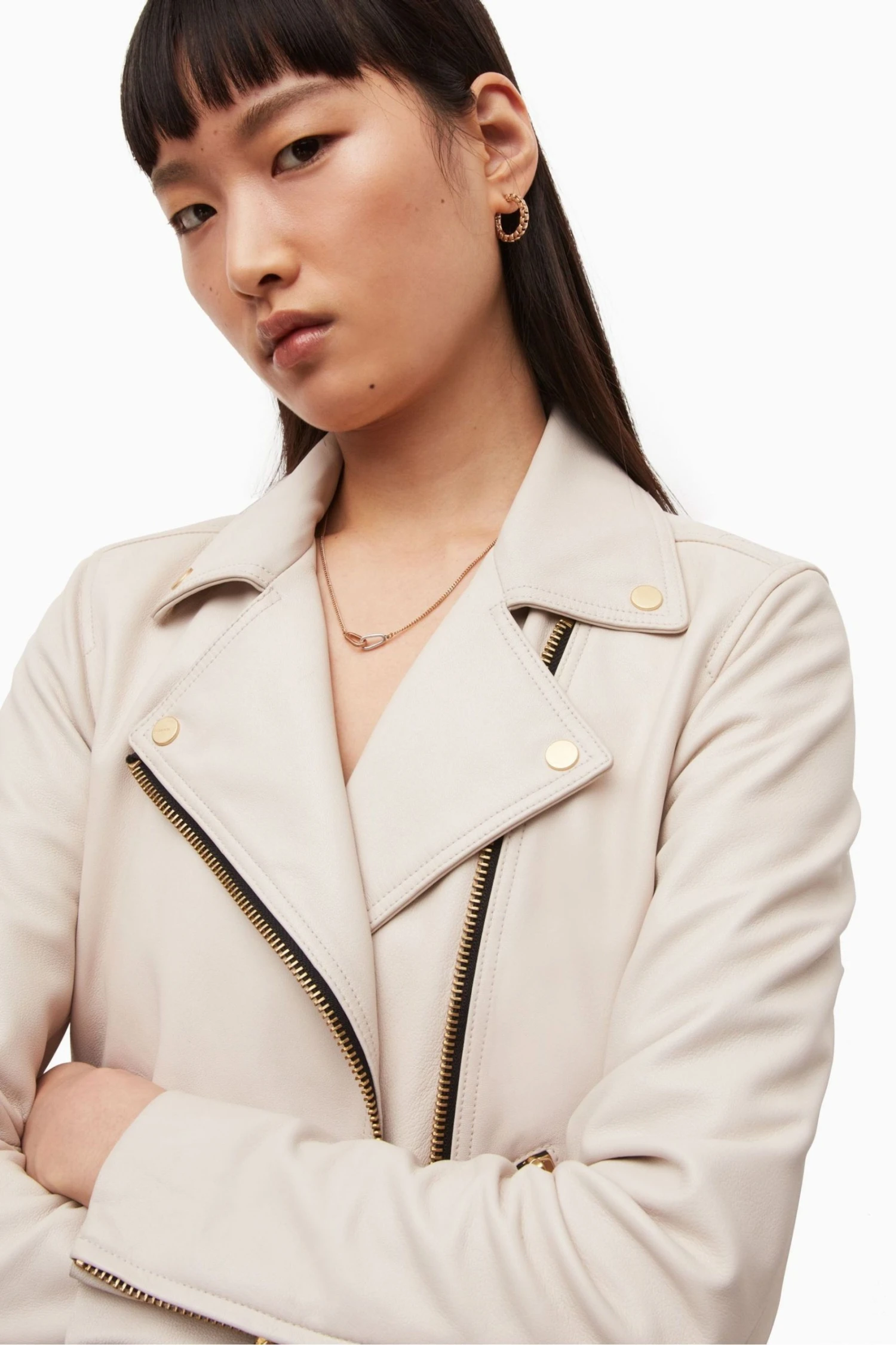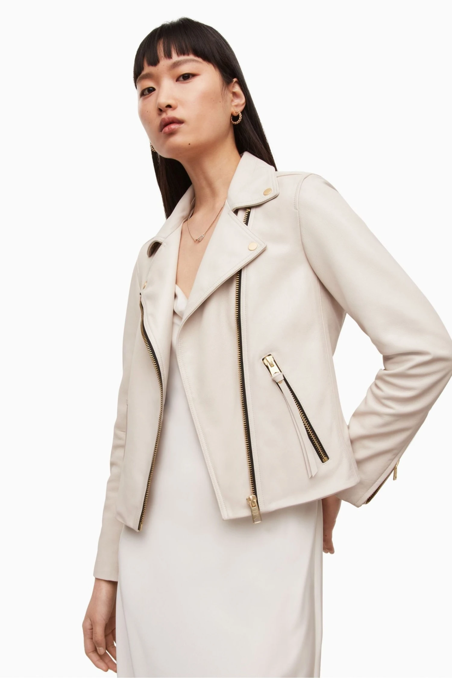 No fuss leathers. The Dalby Biker Jacket is a minimalist design, crafted in a dark raspberry pink hue. Shiny gunmetal trims contrast the smooth leather base. Long sleeve. Fully lined. Leather zip pulls. Two lower pockets. Shiny gunmetal popper fastenings. Model is 5’10” / 177cm and is wearing size UK 10.