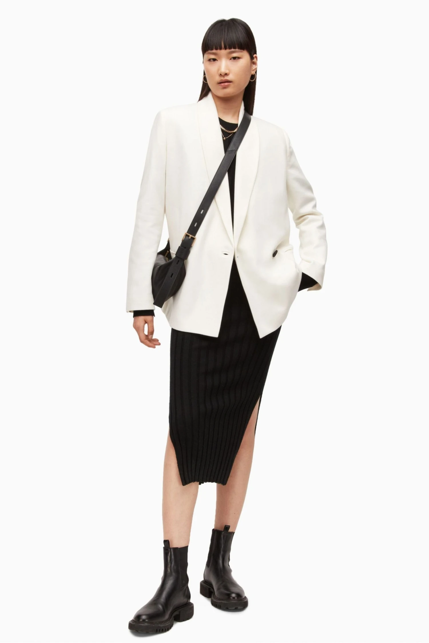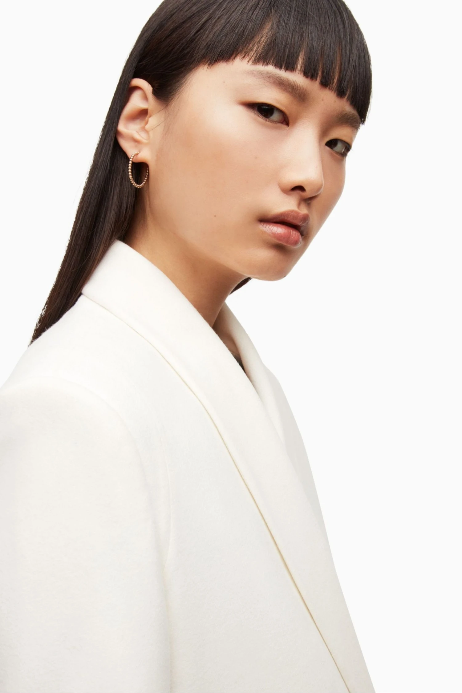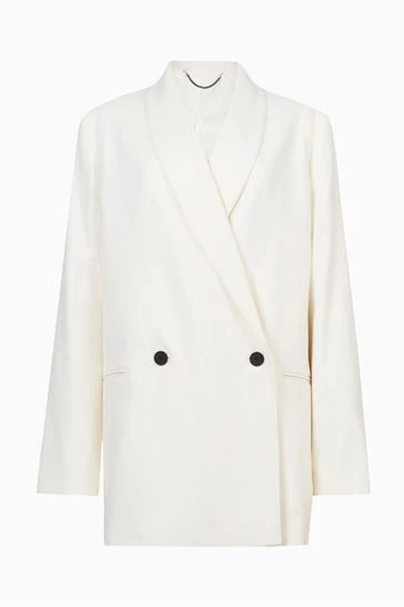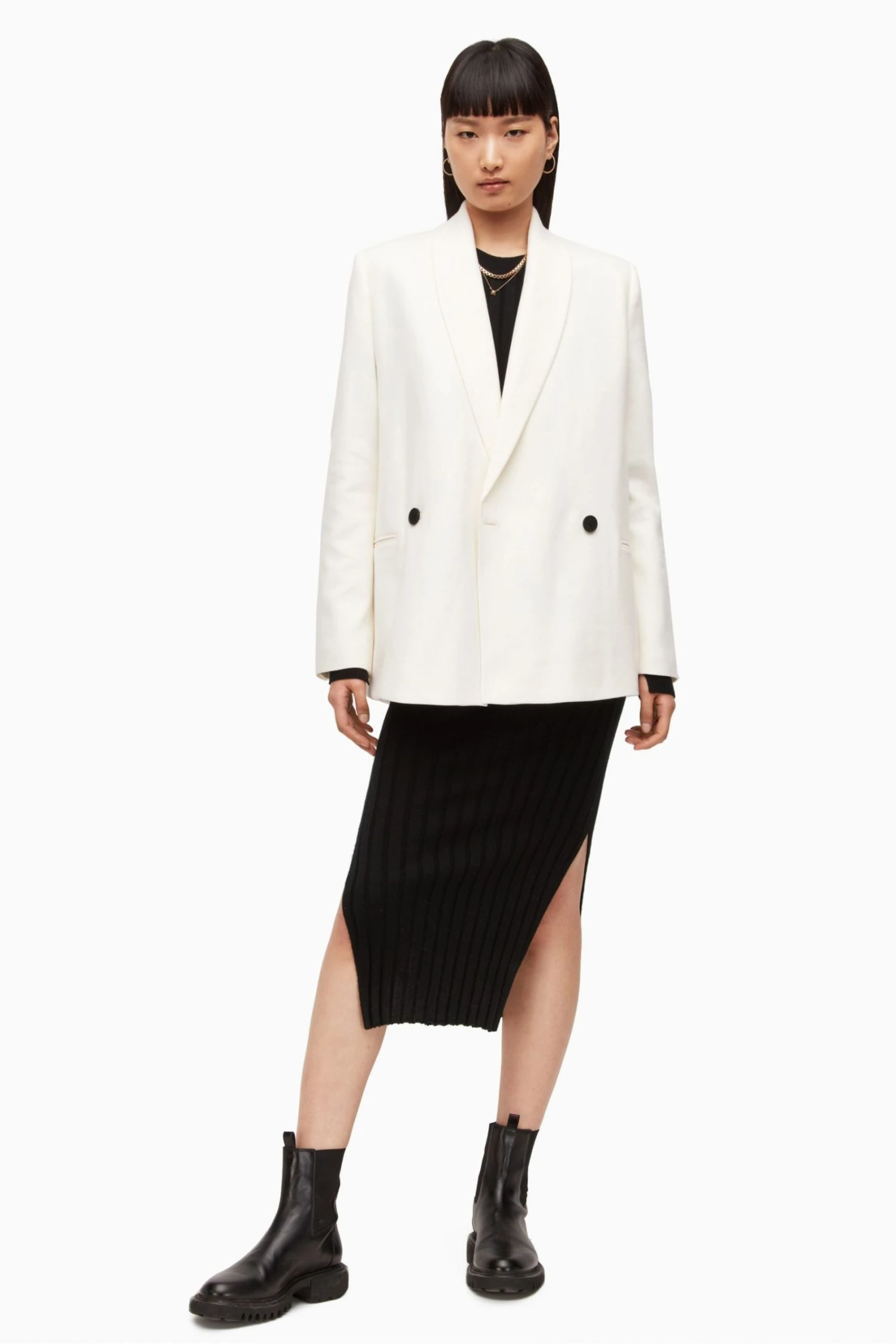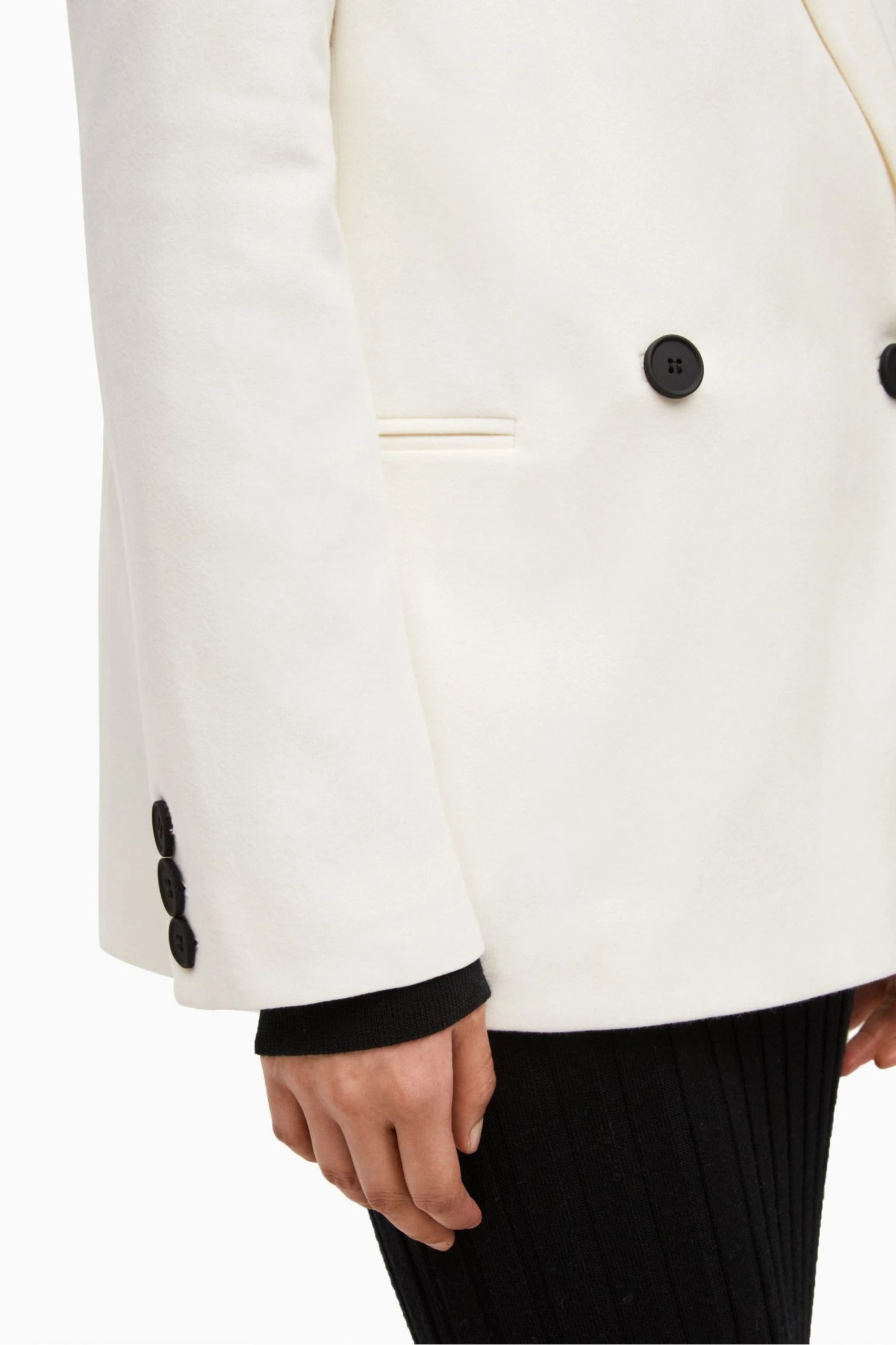 Button closure. Shawl collar. Double breasted. Long sleeves. Matte black buttons. Italian cloth. Two jet pockets. Three interior pockets. Lined. Recycled materials. Sustainable EcoVero viscose. Relaxed fit.