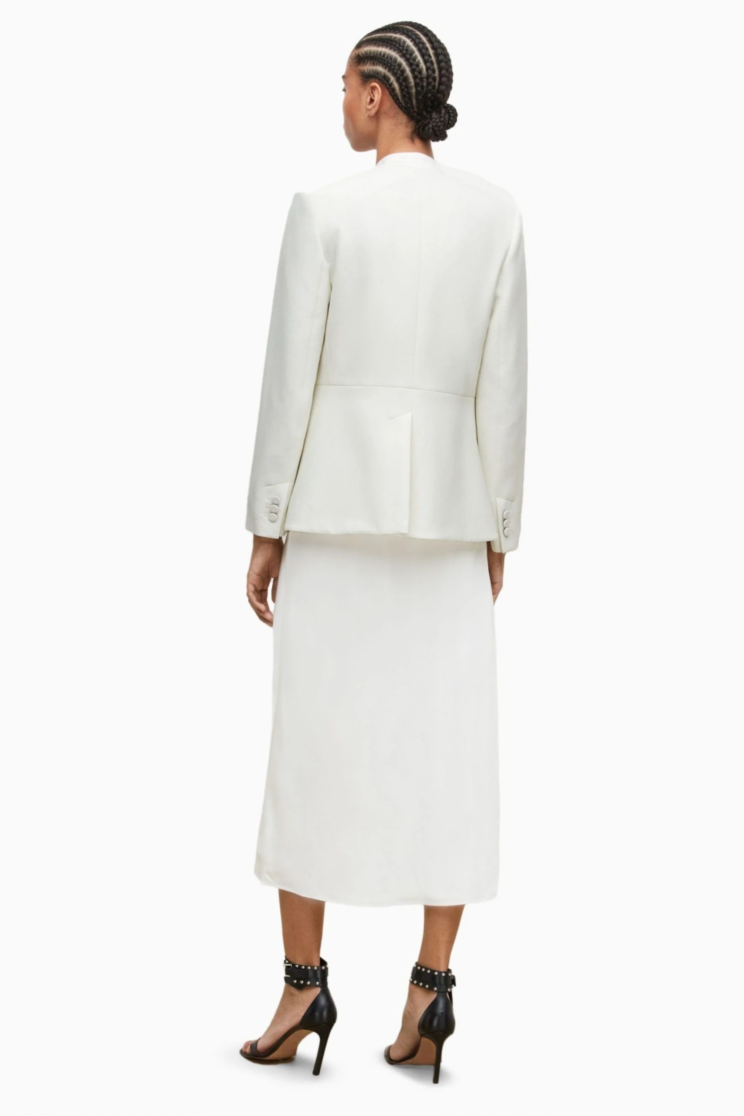 Single button closure. Slim fit. Short length. Collar. Long sleeve. EcoVero and reprieve poly tailored single lapel blazer. Clean construction with satin collar, jet pockets and waist seam. Two pockets. One internal pocket. Lined. RAMSKULL jacquard recycled lining.