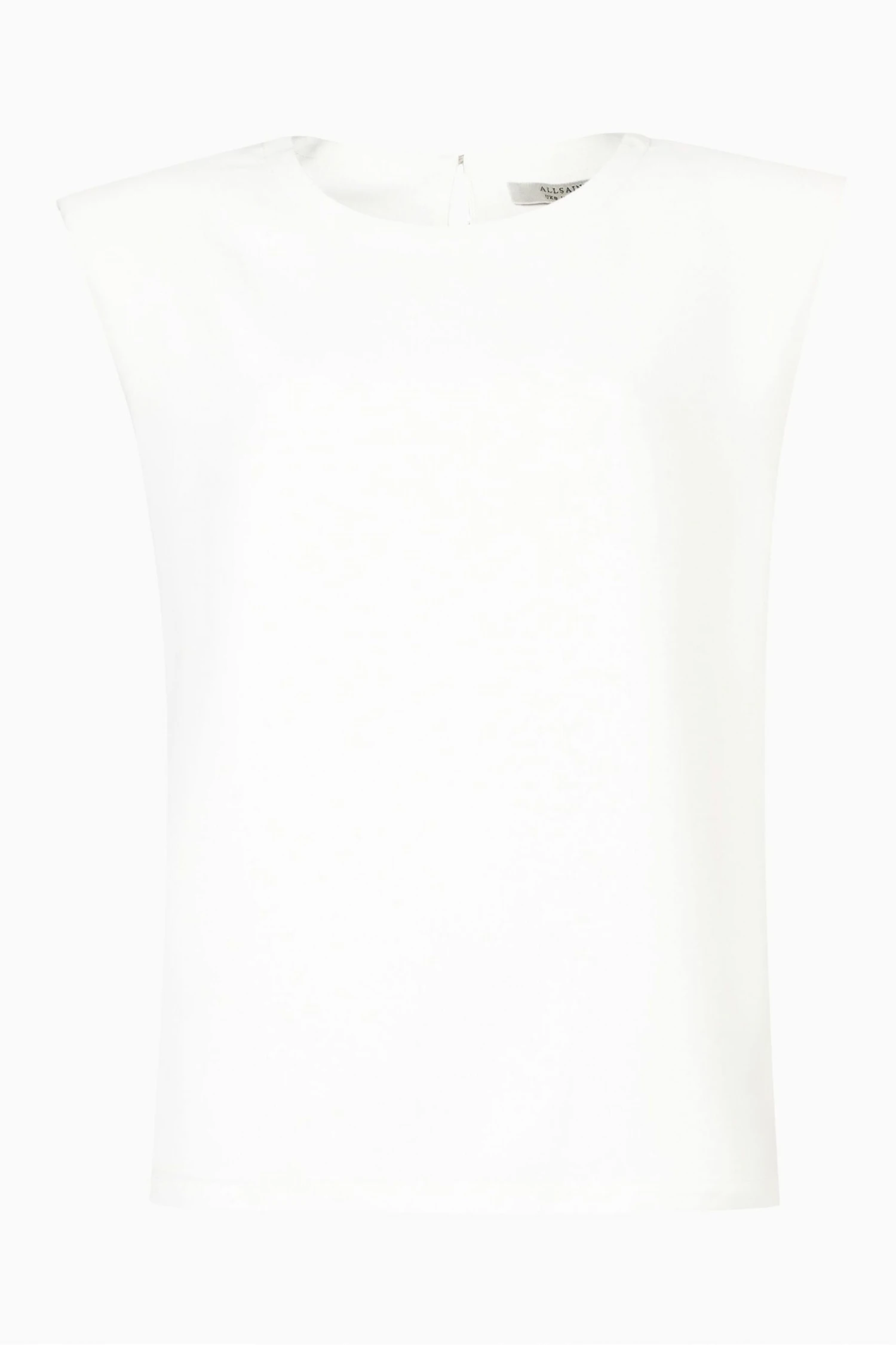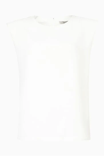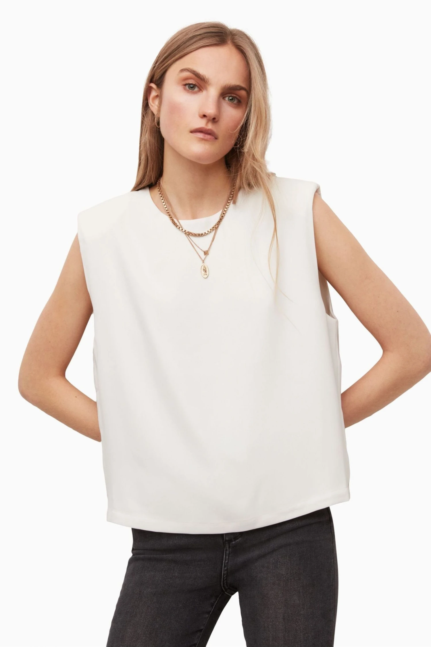 Pull over. Regular fit. Short length. Crew neck. Sleeveless. Easy jersey top with shoulder pads.