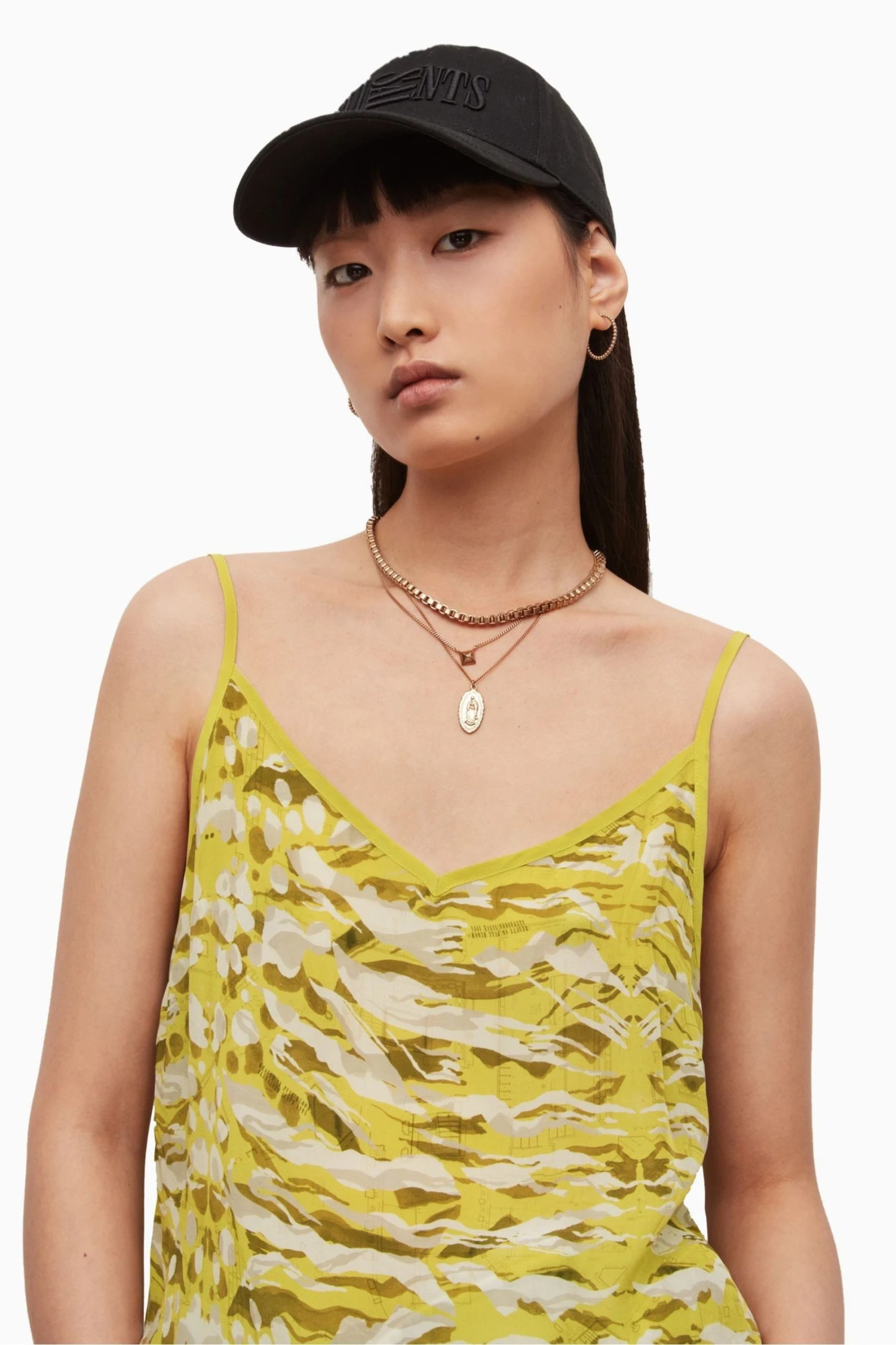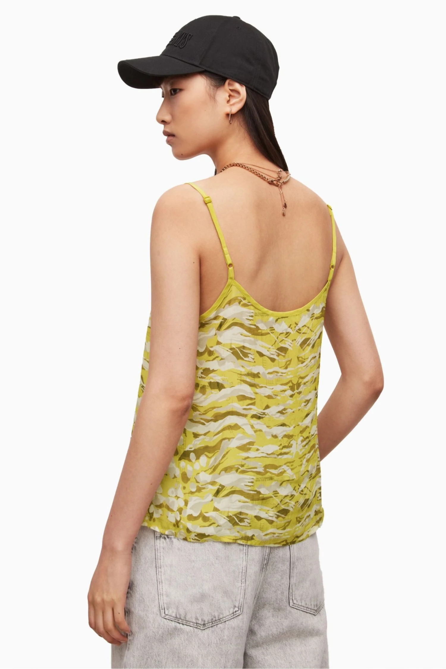 Pull over. Regular fit. Short length. V-neck. Sleeveless. printed cami top. strap adjusters for flexibility and ability to adjust the fit.