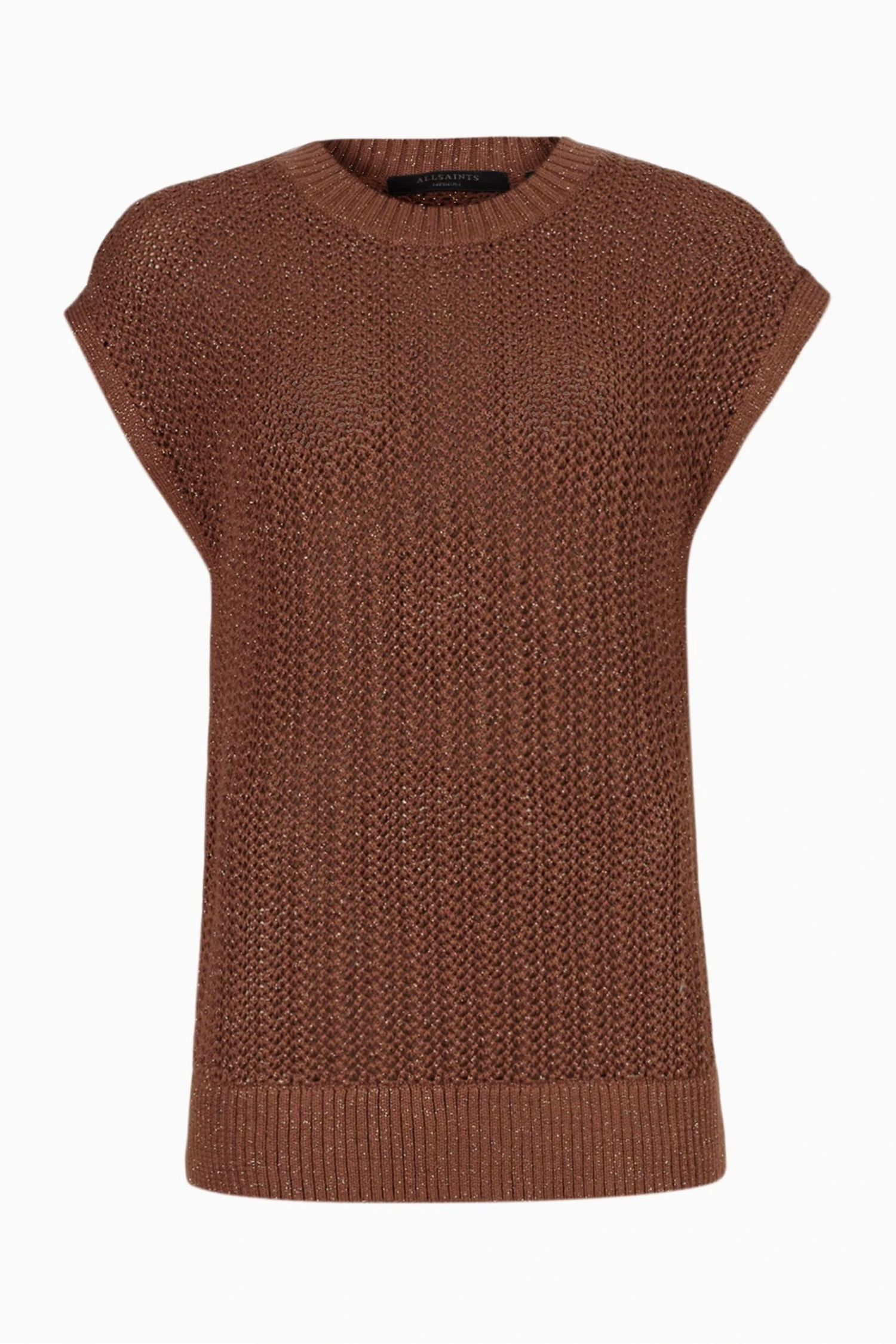 The crew neck sleeveless pullover – mesh stitch tank with high crew neck and deep rib trims, side splits and all needle stitch strappings at side seams and no pockets.