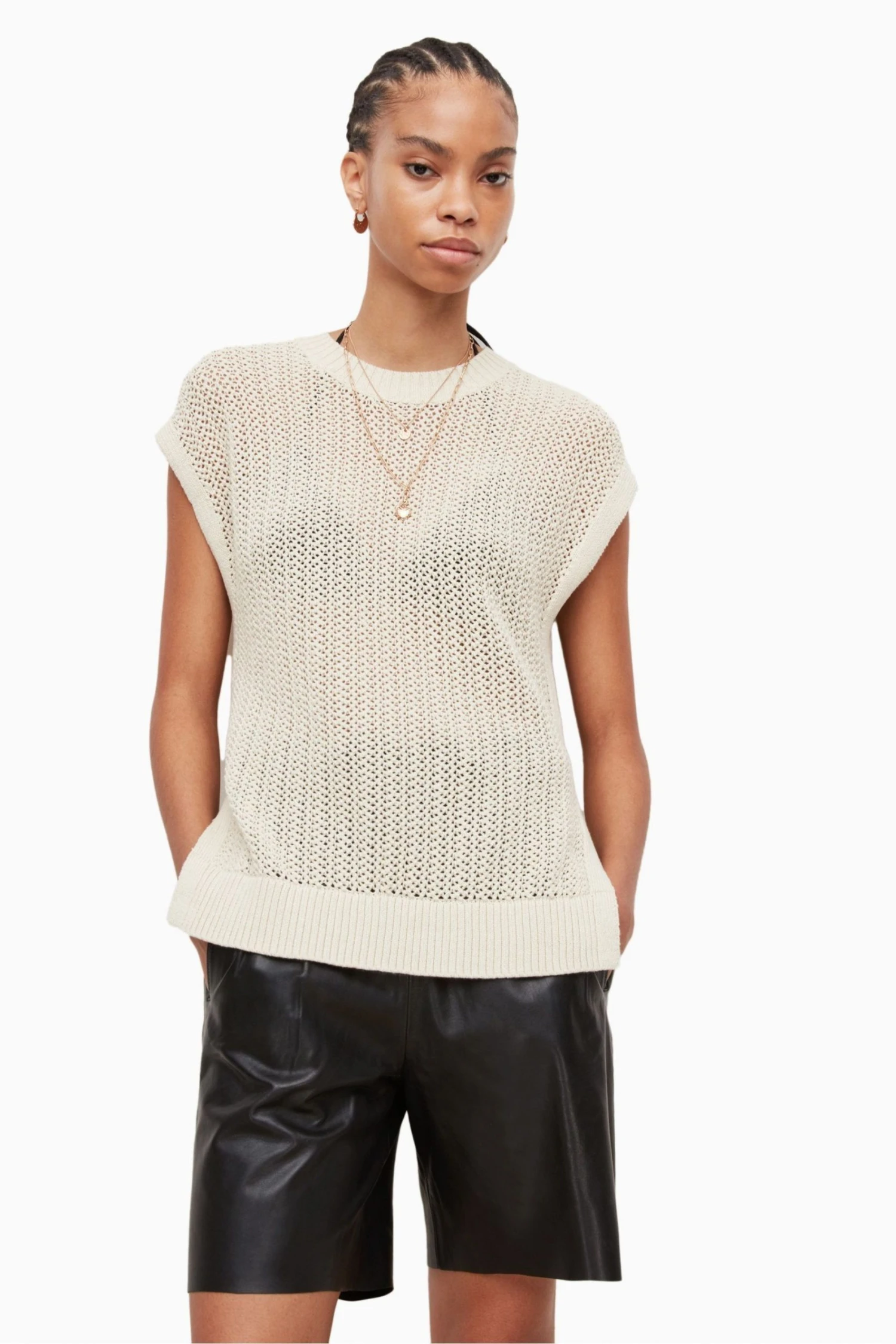 Featuring a pull-over design, crew neck, sleeveless, mesh stitch tank with high crew neck and deep rib trims, side splits and all needle stitch strappings at side seams and no pockets.