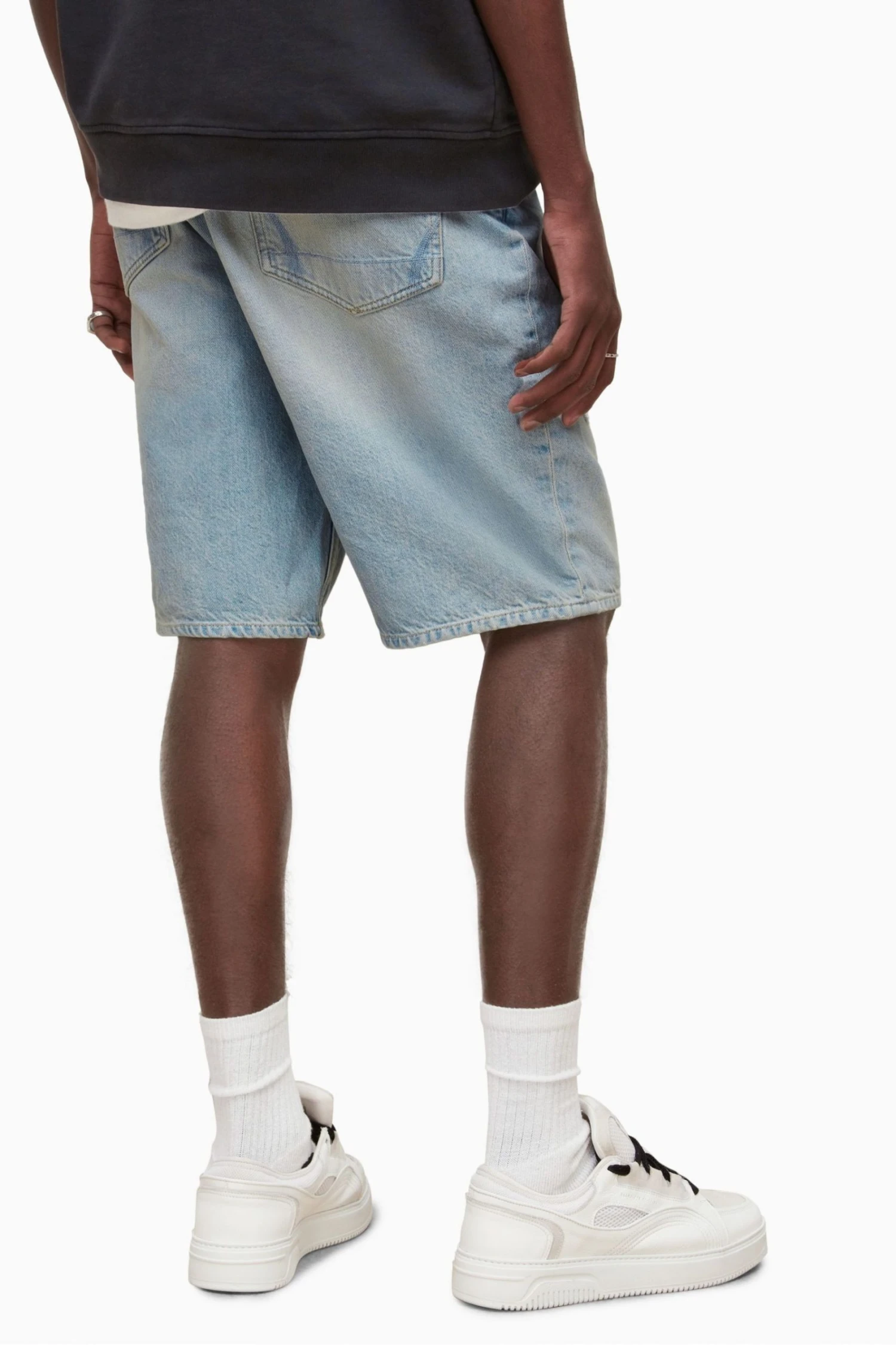 The straight fit shorts with button fly. Light indigo colour with heavy wash. Damages to both leg with tonal fabric backing repair. Jacron patch and jacron washer to front button. Wasitband button and fly buttons have eco finishings. Five pocket jean styling. Mid rise Regular leg.