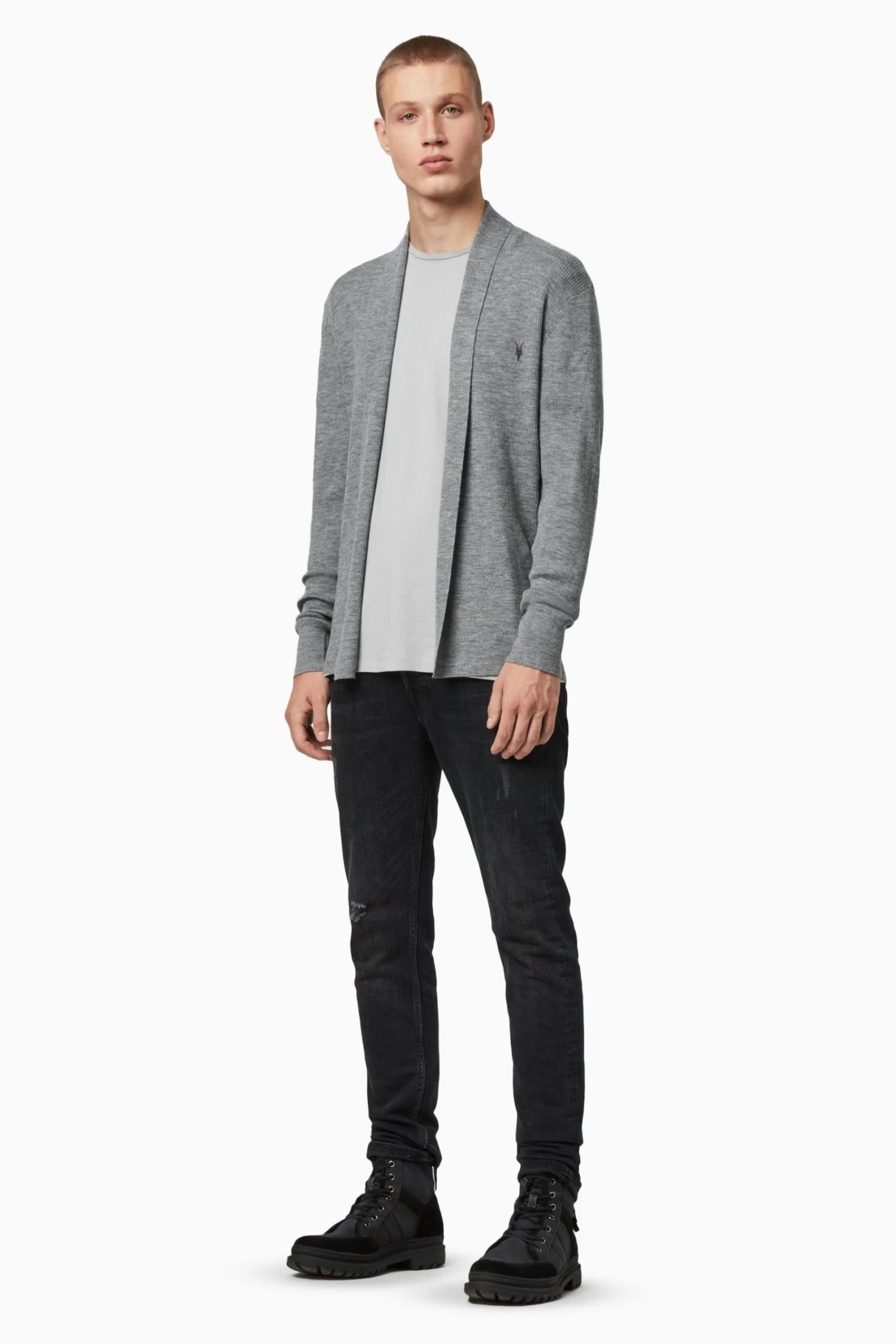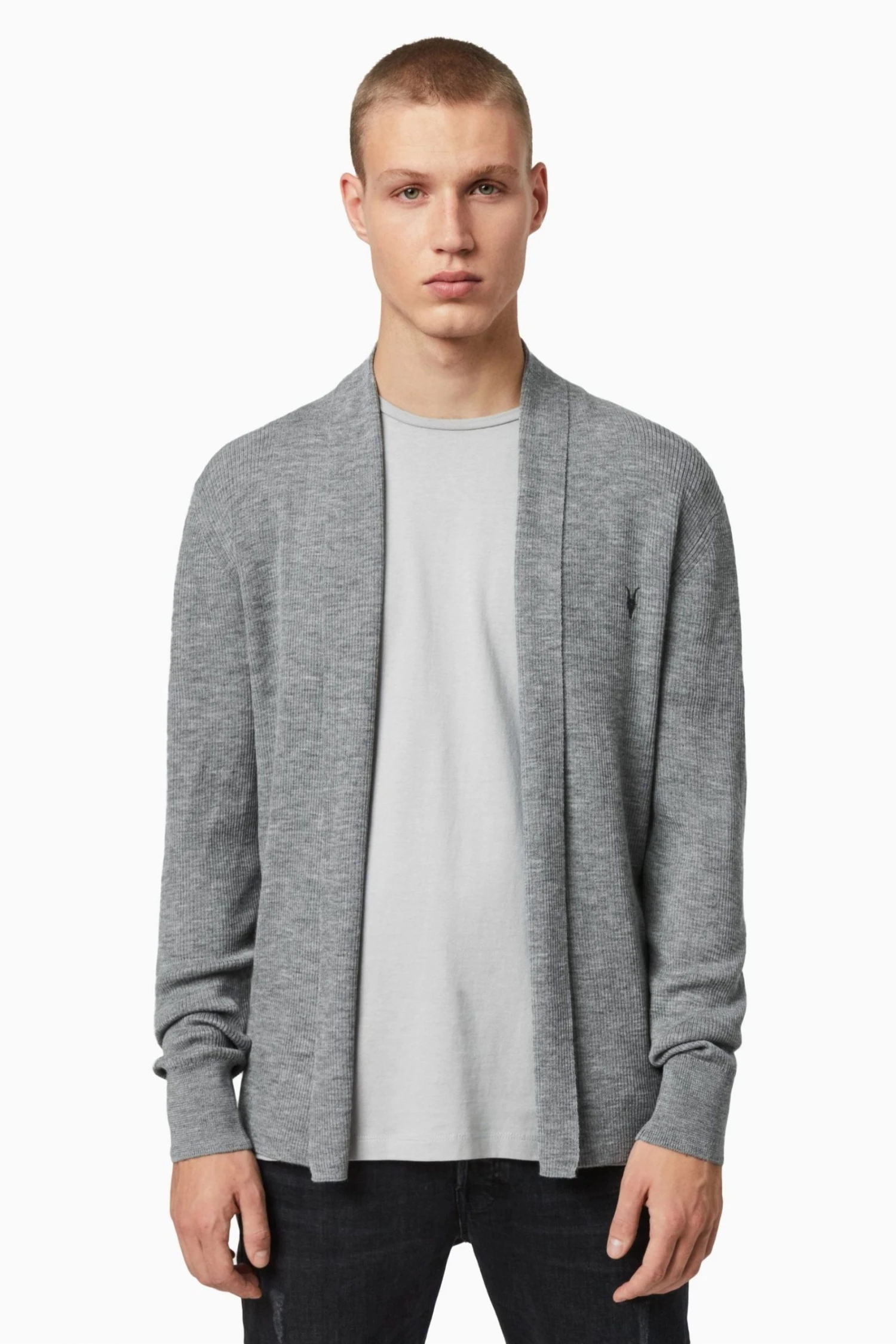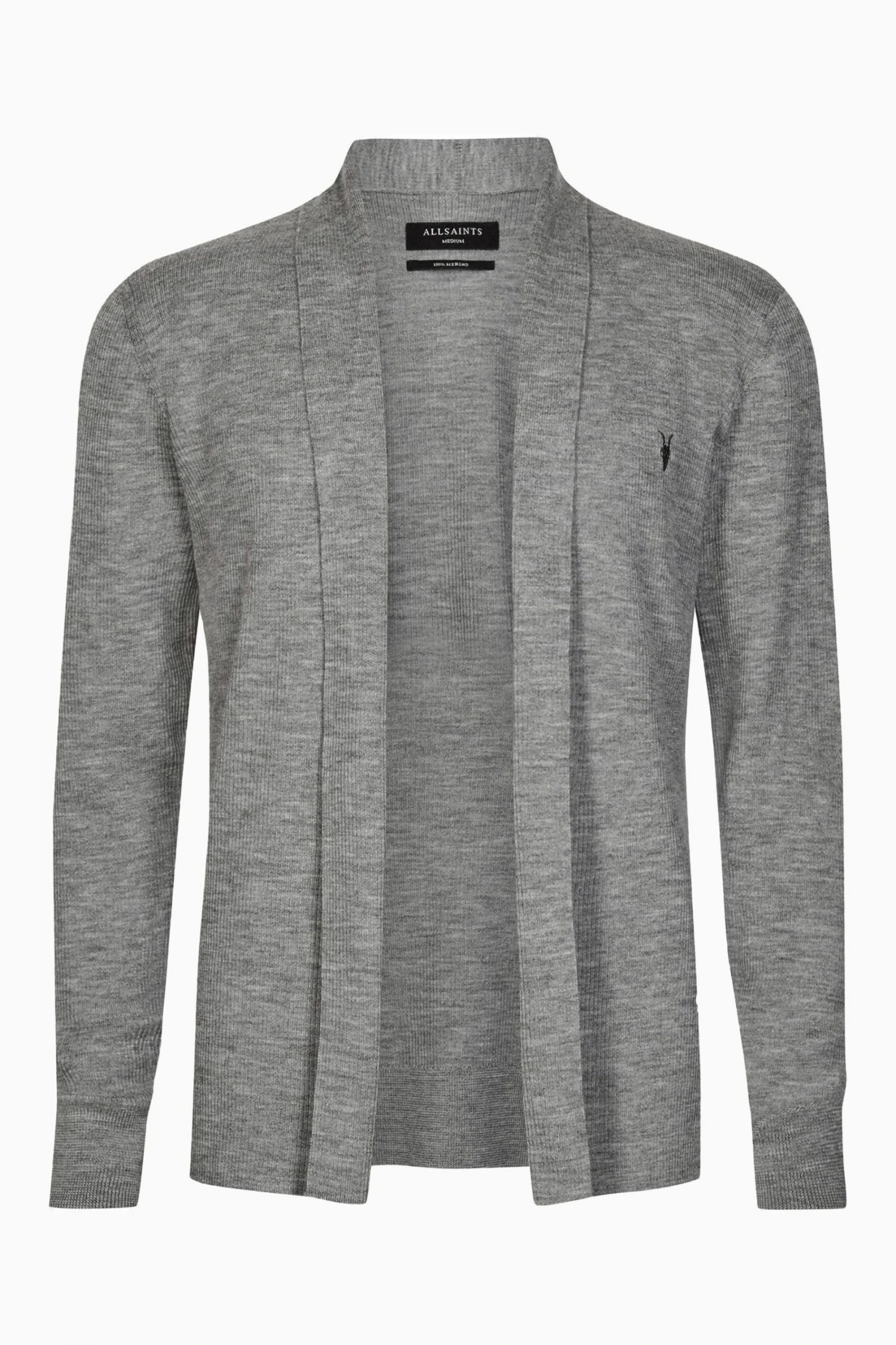Featuring long sleeve, supersoft, open front, ribbed texture and ramskull embroidery.