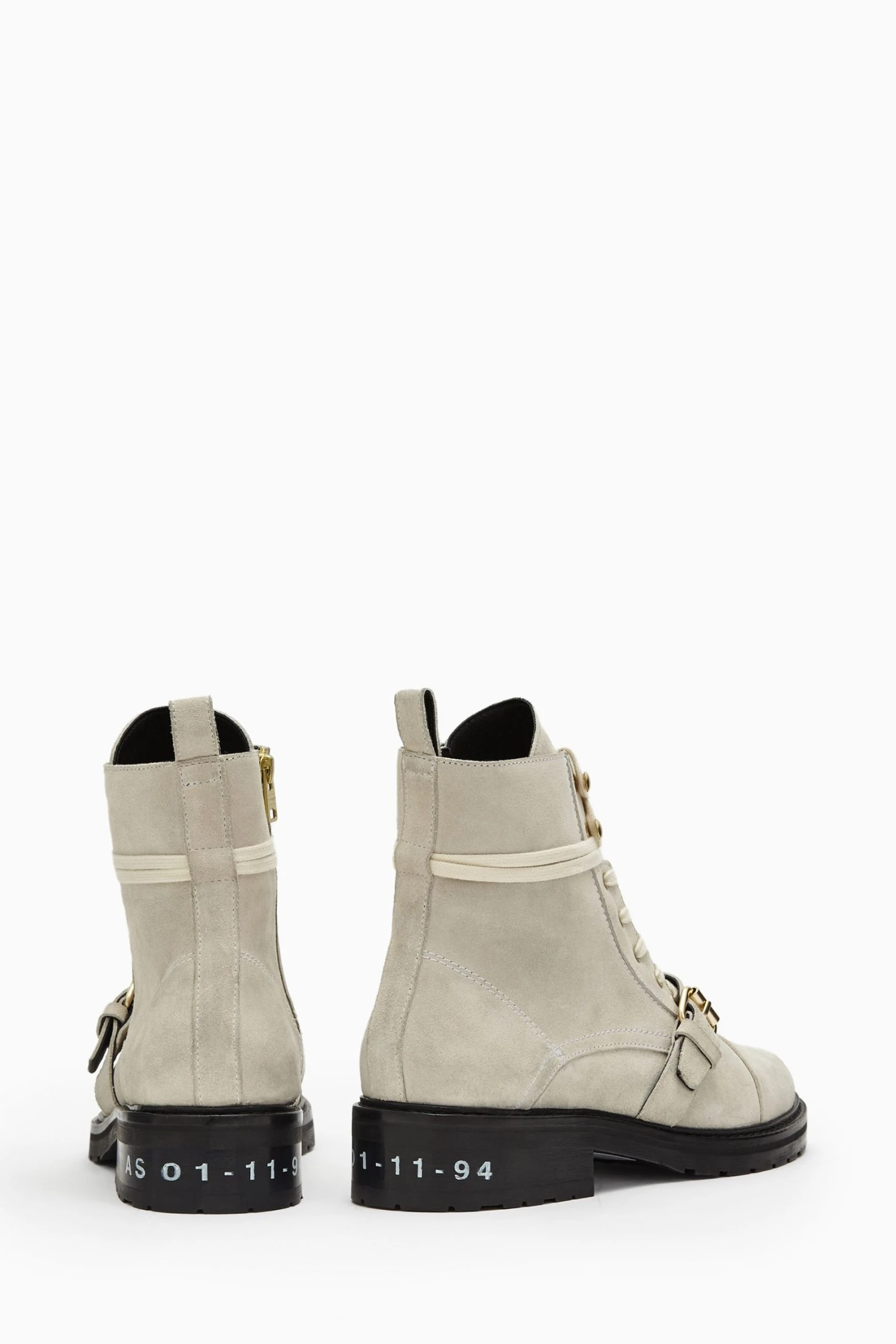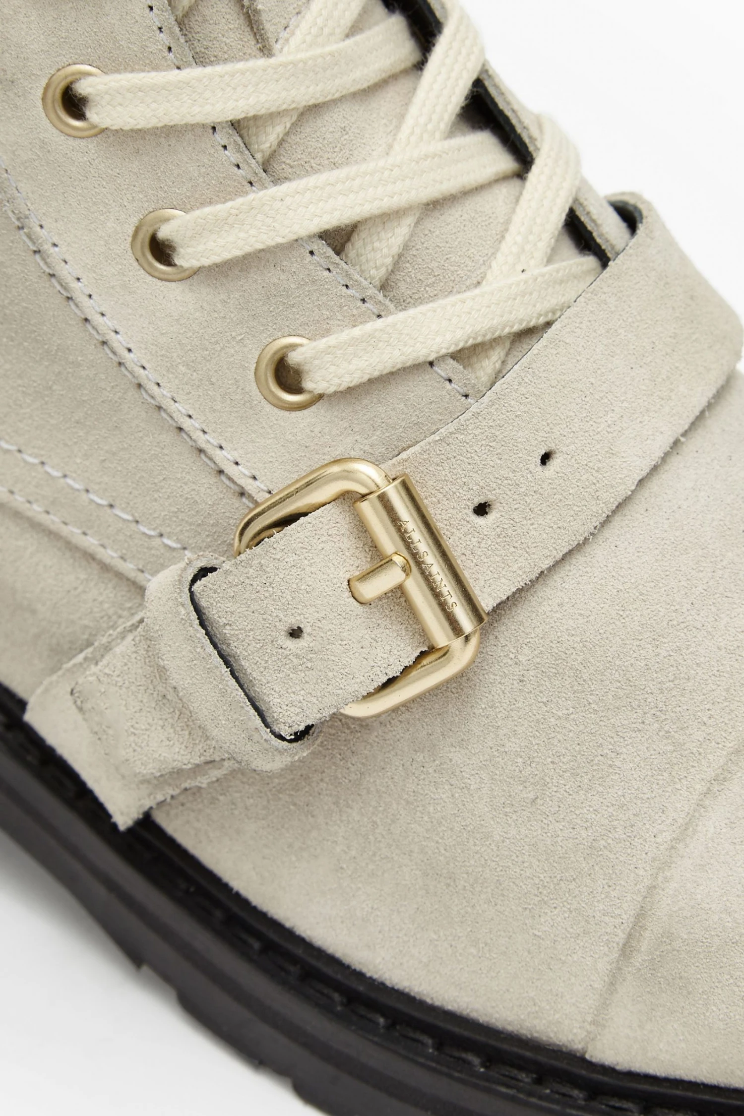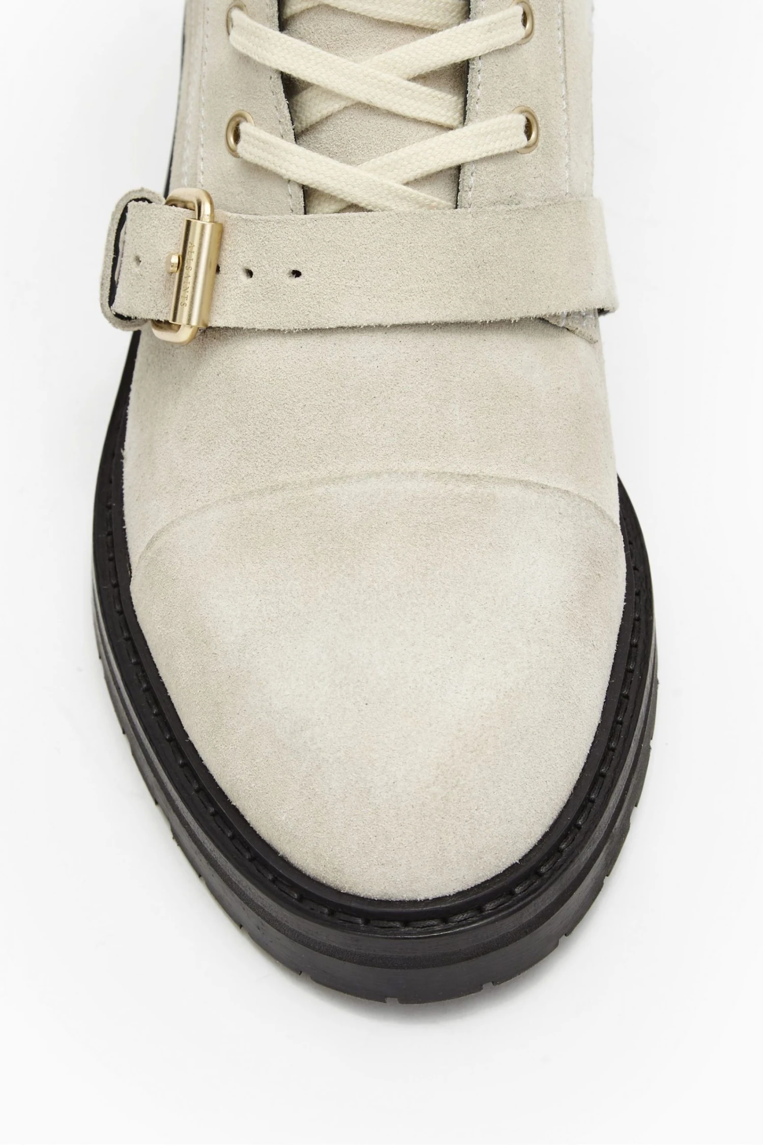 Round toe. Metal eyelets. Rubber tread. Wrap-around laces. Strap across the toe. Leather pull tab.
